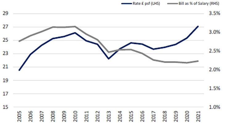 Chart 2. Self-storage rate bill as % of wages in UK, £ /sqft, %, total annual return, 2005-21